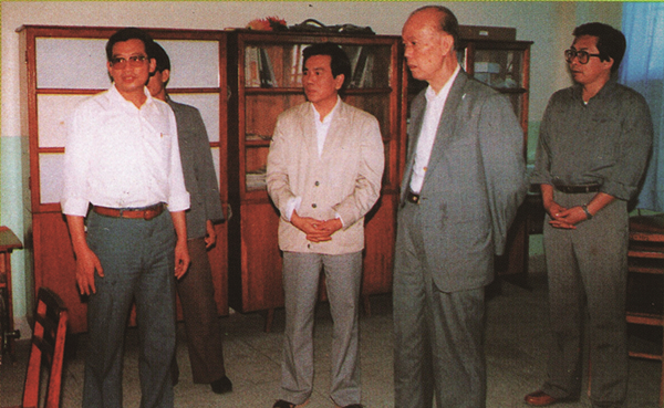 上世纪80年代,许东亮副董事长(右二)莅校视察,商谈筹建“侨总图书馆”有关事宜。