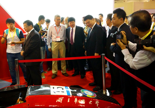 在展区最前端的展示区,停放着我校承志车队新一代HQU-05赛车,吸引着过往观众的眼球。它是我校车辆工程、机械工程、工业设计、自动化等不同学科之间交叉融合创新的体现。