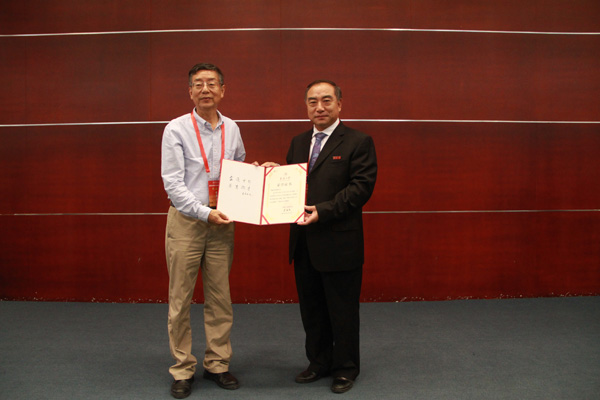 贾益民向李冀闽颁授“华侨大学校友工作杰出贡献奖”荣誉证书