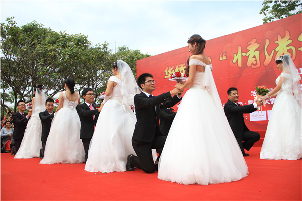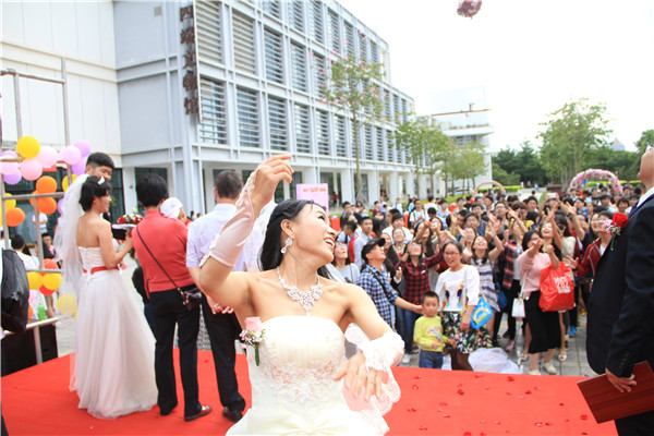婚礼采用中西合璧形式。在欢快喜庆的气氛里,西式求婚和中式三拜浪漫上演,全体新人宣读爱的誓言:一生一世风雨同舟永远相伴,互敬互爱携手共创美好未来。新人们十指相扣,深情相拥,甜蜜溢华园。随后,各国各民族学生代表发放喜糖、新娘抛花球等,将全场气氛引向最高点,现场欢歌笑语,气氛愉快温馨。