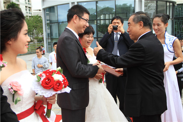 怀揣着对华大最珍贵的青春记忆和炽热情感的校友们准备了一份非常甜蜜的礼物送给母校,他们特意把婚礼纪念日与母校的生日连在一起,让母校见证他们的爱情故事,共同分享他们的幸福喜悦。华侨大学校长、校友总会会长贾益民,副校长、校友总会副会长曾路,校长助理张云波,校友工作办主任项士敏,澳门校友会永远名誉会长郭志忠,澳门校友会会长林辉莲,以及来自世界各地的校友,新人亲友及百余名师生出席了此次婚礼。