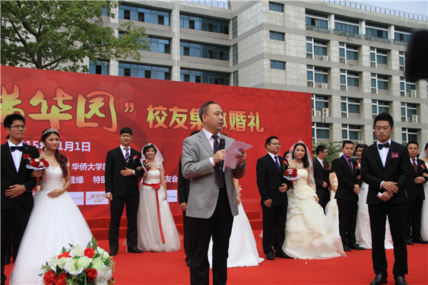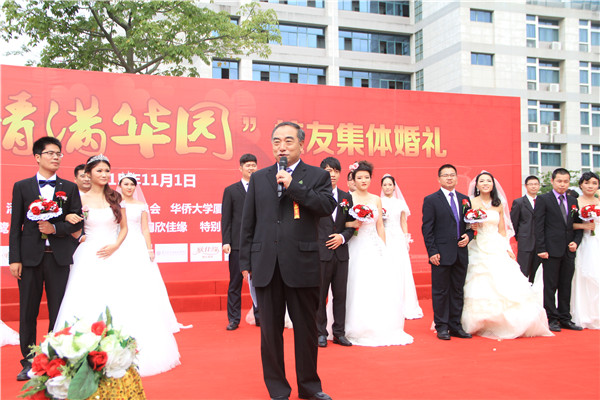 贾益民为新人证婚并致辞。他说,今天自己既当娘家人又当婆家人来证婚是人生中一个很特殊的角色,希望集体婚礼能够每年举办一次,让那些“以侨为缘,以爱相识”的世界各地校友都能在这一天回到母校,举行他们自己的婚礼。贾益民说,无论何时何地,母校永远是最温暖的家园。