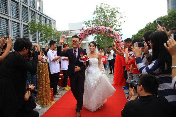 2014级哲社硕士马莹与他的爱人杨界强也是此次集体婚礼的主角之一。“我们家里的还没办,今天是我第一次穿婚纱,觉得非常幸福。”马莹藏不住喜悦地说,“能够抓住青春的尾巴,留下学生时代的纪念,对于我们意义非凡,贾校长给我们颁发证书时,我非常激动,感恩母校。”