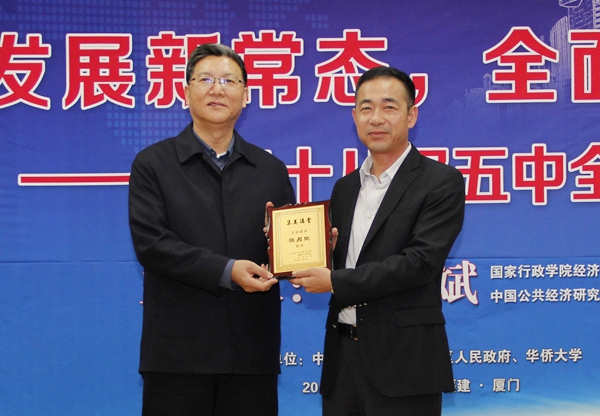 集美区委书记李辉跃为张占斌教授颁发“集美讲堂”纪念牌