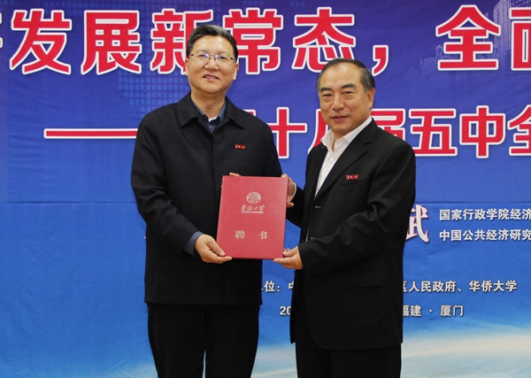 校长贾益民为张占斌教授颁发华侨大学兼职教授聘书并佩戴校徽