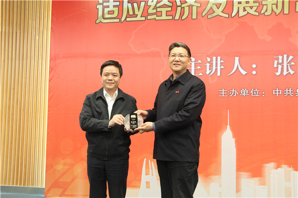 泉州市委常委、秘书长、统战部部长翁祖根为张占斌教授颁发“华大讲堂”主讲嘉宾纪念牌