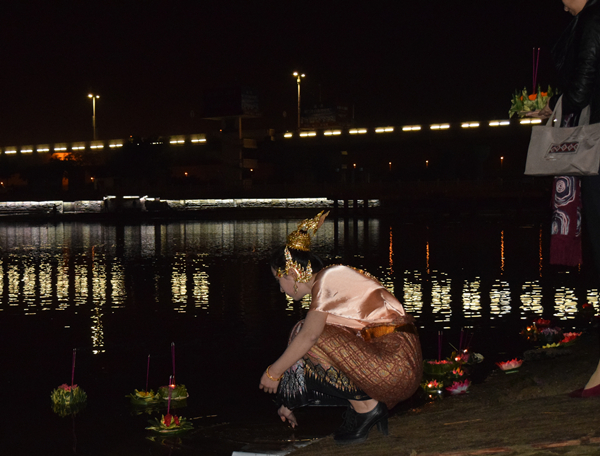 晚会过后,水灯小姐们、水灯先生们带领师生到龙舟池畔放水灯,祈盼来年平安幸福,祈盼中泰友谊地久天长。