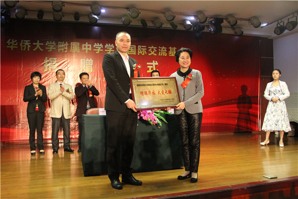 签约捐赠仪式于当日下午在椿萱楼举行。东南大宗商品交易中心副总裁黄建民与华大附中校长颜乃新代表双方在捐赠协议书上签字。华侨大学党委副书记朱琦环向黄建民授予写有“情满华园,大爱无疆”字样的荣誉牌匾。