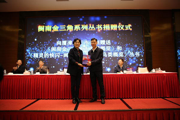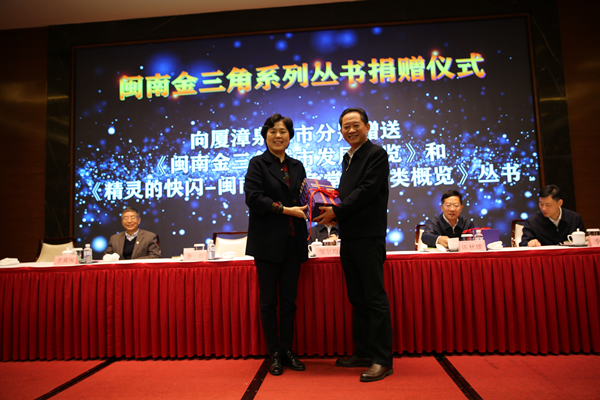 12月29日,华侨大学哲学社会科学文库·闽南金三角系列丛书《闽南金三角城市发展概览》《精灵的快闪——闽南金三角常见鸟类概览》出版发行和赠书仪式在厦门举行。福建省原副省长李红,厦门市原市委书记邹尔均,华侨大学原党委书记李冀闽,厦门市委副书记陈秋雄,漳州市委常委、宣传部部长刘伟泽,泉州市委常委、秘书长季翔峰等出席活动。华侨大学党委副书记刘斌主持发布会并致辞。