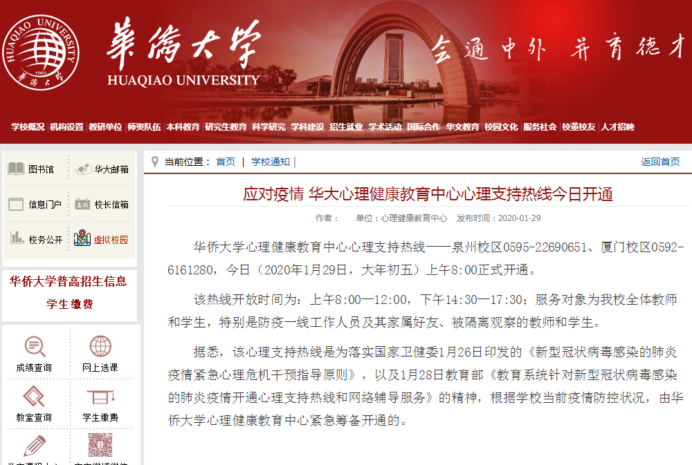 华侨大学率先在全省发出推迟开学的通知,阻断疫情传播。要求在学校通知正式开学之前,全体学生不要提前返校,对于确实需要提前返校的学生,将统一在医学观察隔离区隔离14天后再进行正常学习生活。针对湖北籍师生,一律要求暂不返校,并做好健康管理,及时反馈信息;其他地区教职工返校实行审批制度。