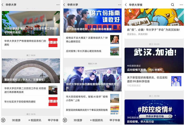 “新型冠状病毒是什么?如何防治?”“新型冠状病毒肺炎的9个事实及预防指南”……学校在校园主页开设“防控疫情专栏”,上线智能AI助手“疫情小百科”,积极通过新媒体、校内宣传栏开展宣传普及疫情防治知识和防控要求宣传工作,引导师生理性对待疫情,增强自我防范意识。截至2月3日,学校通过“华侨大学”微信公众号推送疫情相关知识和学校疫情防控工作情况22篇,阅读量达到17.67万。