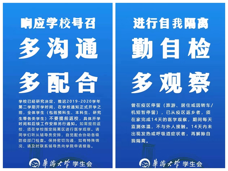 华侨大学青年学子虽身处祖国各地,但是用各自的行动阐释“华大人”的社会责任感。1月27日,华侨大学学生会发出《致全体华大学子的倡议书》,倡议响应学校号召,不提前返校,戴口罩、勤洗手,不信谣、不传谣等。海内外各地的学子们积极响应,纷纷做出承诺,并表达温暖的祝福。“我承诺:随时佩戴口罩,保护自己也保护他人。病毒无情,人间有爱!我在中国台湾为武汉加油!”“坚决支持学校安排,不提前返校”……截至2月3日,所有学生无人提前返校。