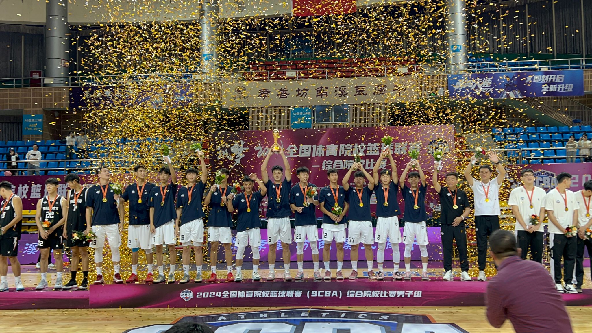 2024全国体育院校篮球联赛(SCBA)综合院校比赛男子组决赛10月19日在宜宾市南溪区文体中心落下帷幕,全国28支高校男子篮球队在9天赛程里开展了126场激烈角逐。华侨大学男篮在决赛中以80比76击败湖南师范大学男篮,以9战全胜的战绩拿下冠军。华大男篮主教练周鲁男荣膺赛事最佳教练员称号,主力控卫姜贺获评最佳球员。