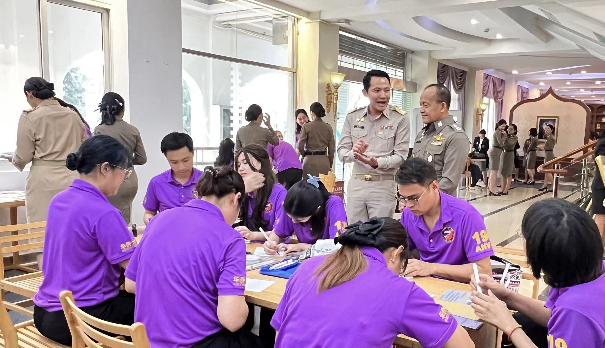参观访问华侨大学华文学院期间,恰逢泰国诗琳通公主69岁生日,代表团成员与目前在校就读的第18期外国政府官员中文学习班泰国学员一起,在华侨大学诗琳通图书馆举办“纪念泰王国诗琳通公主殿下寿辰日庆祝活动”,邀请在校学生书写表达祝福的话语,传承“中泰一家亲”的情谊。
