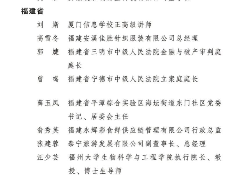 日前,全国妇联发布《关于表彰全国三八红旗手标兵、全国三八红旗手、全国三八红旗集体和全国巾帼文明岗、 全国巾帼建功标兵、全国巾帼建功先进集体的决定》,我校法学院1999级校友、三明市中级人民法院金融与破产审判庭庭长郭婕,法学院2009级校友、宁德市中级人民法院立案庭庭长曾鸣被授予2022年度“全国三八红旗手”荣誉称号。