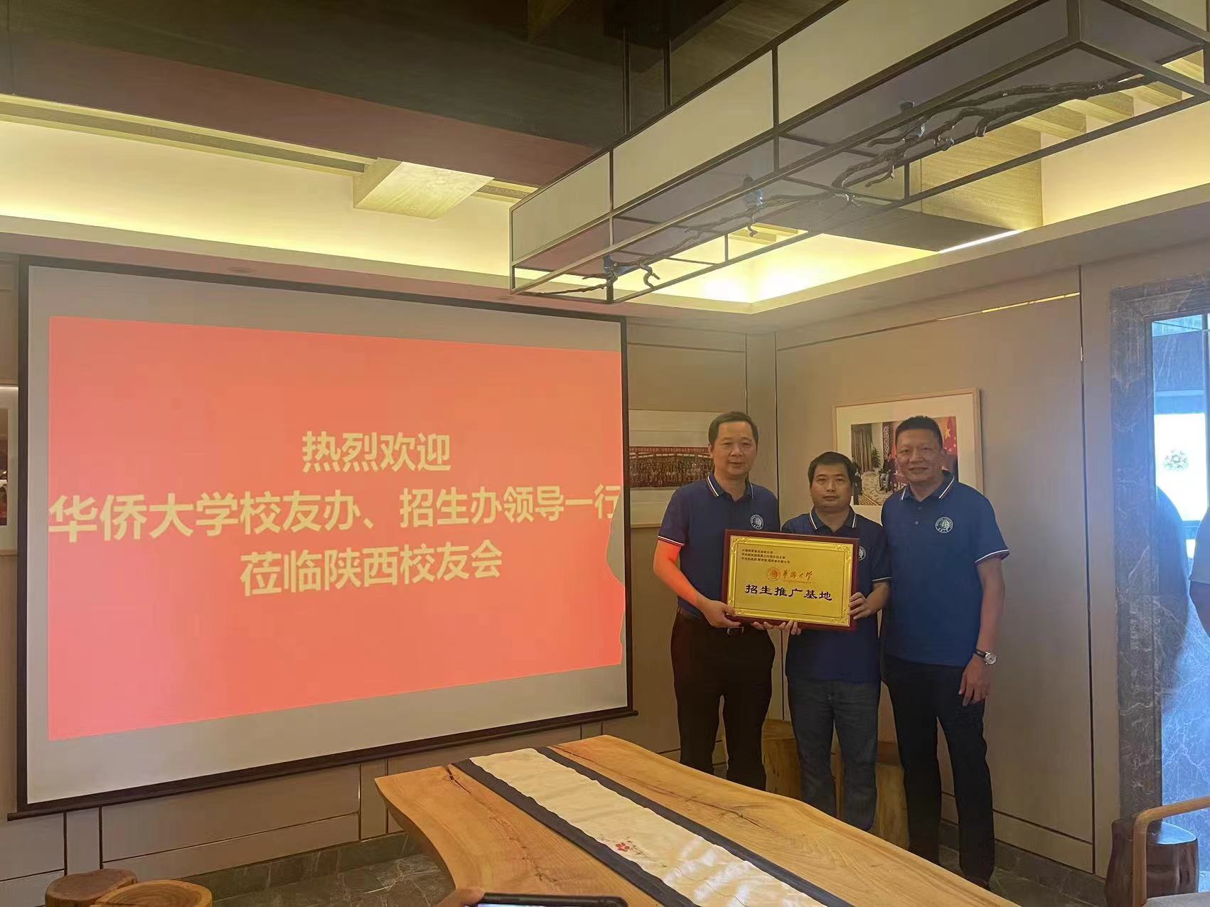 23日下午,我校工作人员与陕西校友会座谈,向校友代表介绍了母校近年来的发展成果、在陕招生政策,并向陕西校友会授“招生推广基地”牌,为陕西校友会会长林连枫、秘书长杨奕琨等6位代表颁发“招生推广大使”纪念牌。林连枫为近年来母校发展取得的喜人成果感到荣耀,表示在陕校友十分荣幸能担任招生推广大使,为母校发展贡献自己的力量。24日下午,校友会代表10人与招生工作人员共同参加了西安现场招生咨询会,以个人发展经历现身说法,为到场咨询的学生介绍我校情况,答疑解惑,动员优秀学子报考我校。