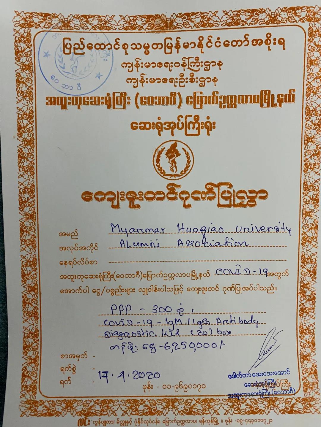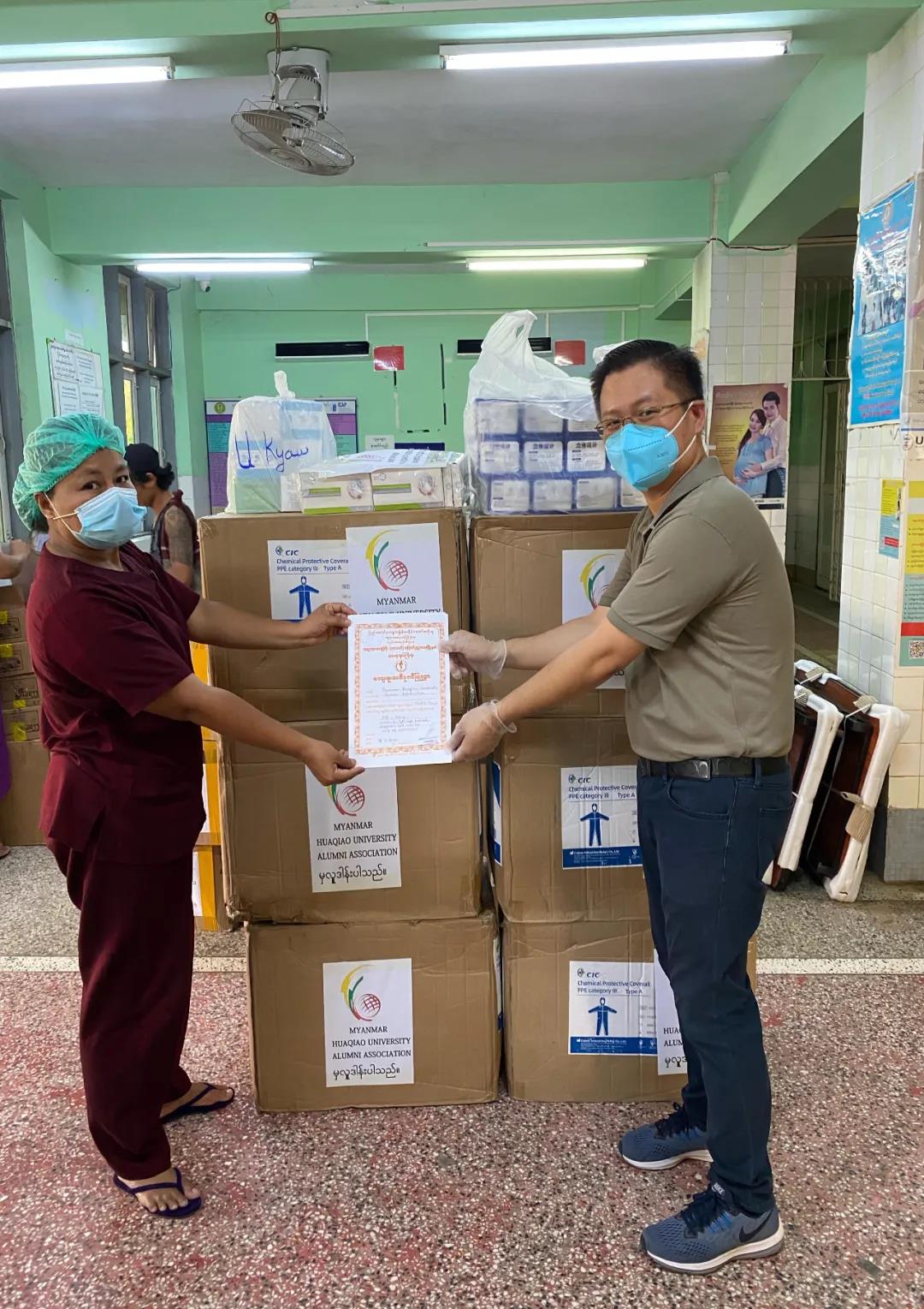 4月17日,华侨大学缅甸校友会向曼德勒省办公厅和仰光维巴基医院捐赠防疫物资。据了解,华侨大学缅甸校友会向曼德勒省办公厅捐赠了善款600万缅币、7150只口罩、54瓶洗手液、5盒手套和1台吸痰机;向仰光维巴基医院捐赠300套医用防护服、一批核酸检测试剂盒及口罩物资总价值625万缅币。曼德勒代省长、仰光维巴基医院负责人分别接见了华侨大学缅甸校友会代表,接受捐赠并为其颁发捐赠证书。