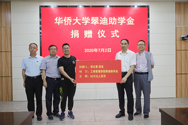 捐赠仪式7月2日上午在陈嘉庚纪念堂二层会议室举行。副校长王秀勇代表学校接受捐赠,并向张云星颁发捐赠证书。我校校友工作办公室、工商管理学院负责人等参加捐赠仪式。