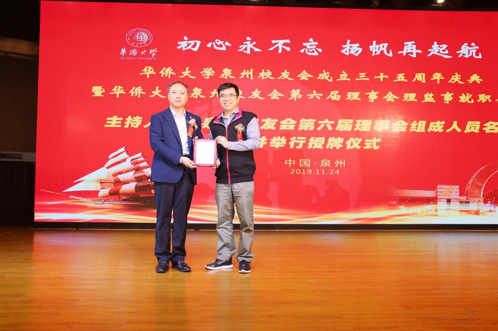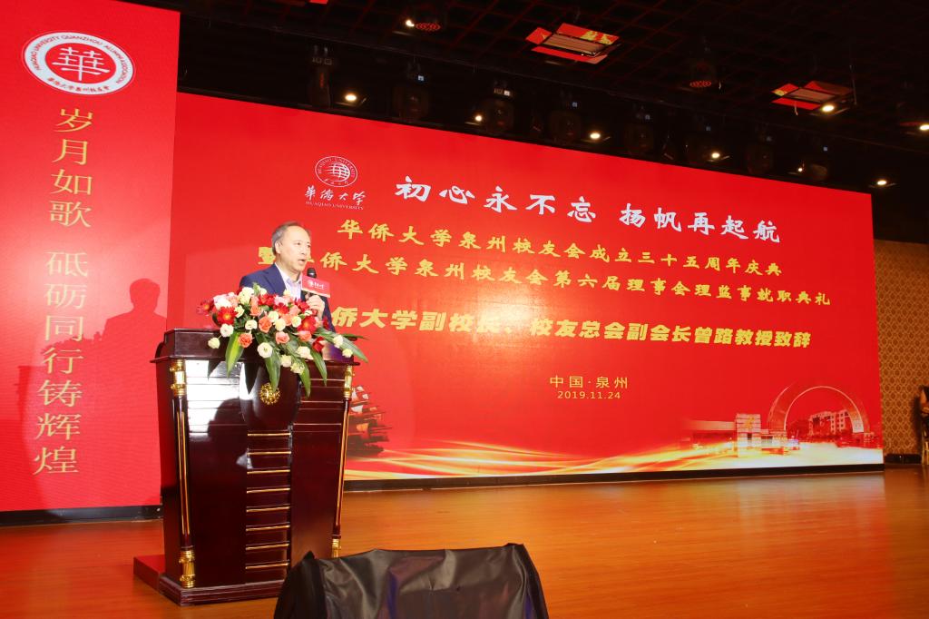 11月24日,初心永不忘,扬帆再启航——华侨大学泉州校友会35周年庆暨第六届理监事会就职典礼在泉州市区海丝博亚国际大酒店举行。泉州市侨联主席陈晓玉女士,华侨大学副校长、校友总会副会长曾路教授,华侨大学副校长彭霈教授,招商银行泉州分行行长詹毅先生,华侨大学原老校长陈觉万教授,原老校长杨翔翔教授,原党委书记李冀闽教授,原党委副书记、纪委书记朱琦环女士,原副校长吳季怀教授,原泉州市政协副主席、泉州市侨联主席陈秋菊校友,原泉州市政协副主席、致公党主委林玉莲,原泉州市中级法院党组副书记、常务副院长、泉州企业与企业家联合会执行副会长吳俊民校友等领导和嘉宾及全体理监事、新老校友共400多人参加庆典,共襄盛会。