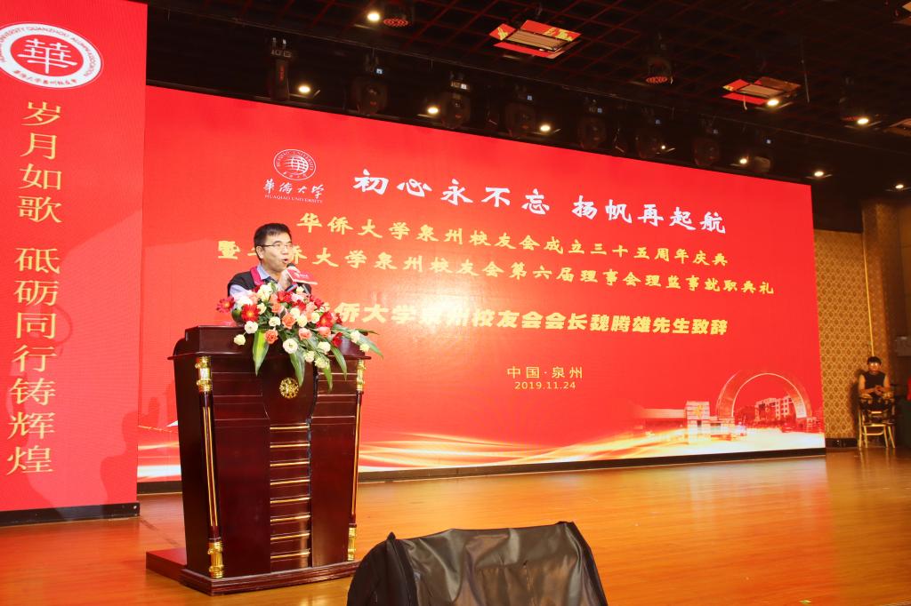 魏腾雄会长代表泉州校友会新一届理监事会致辞,并做校友会工作报告。陈晓玉主席代表泉州市侨联致辞,对泉州校友会成立三十五周年庆典暨理监事就职典礼表示祝贺,对泉州校友会第六届理事会的建设与发展提出希望、寄予厚望。曾路副校长代表学校、校友总会向泉州校友会表示祝贺,对泉州校友会凝聚校友力量、助力校友事业发展而做了大量富有成效的活动予充分肯定,表扬泉州校友会为各地校友会树立了标杆的示范作用。招商银行泉州分行詹毅行长、华侨大学湖南校友会赵杰秘书长、华侨大学马来西亚校友会苏耀原会长先后致辞。