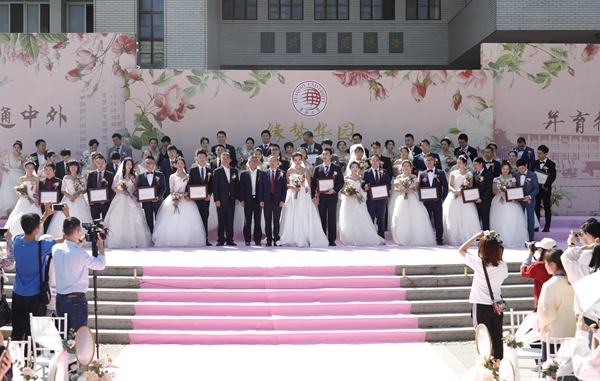 踏上粉色地毯,一对对新人脸上洋溢着幸福的微笑,手牵手,依偎着走过鲜花、气球的海洋,接受亲朋好友的美好祝福。他们之中,有将自己的第一次婚礼置于母校的幸福新人;还有不少毕业多年后,带着孩子来看望母校的三口之家;更有者,想要用一场有仪式感的婚礼,纪念彼此三十年的相识相知相恋……