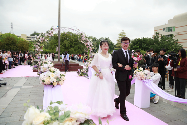 走过由鲜花和气球点衬着、洋溢着浪漫气息的粉色地毯,穿过精心布置的花门,一对对盛装加身的新人,或牵手、或挽依,在无数亲朋好友的祝福声中,依次走上婚礼的舞台。他们中有的从高中就开始爱情长跑;有毕业12年后,带着活泼可爱的孩子回来看望母校的三口之家;更有参加完集体婚礼,当天还要在母校举办个人婚礼的幸福新人。当新人走过花门,脸上洋溢的笑容总会激起现场热情的欢呼,现场师生纷纷拿出手机、相机,争相记录这浪漫幸福的画面。
