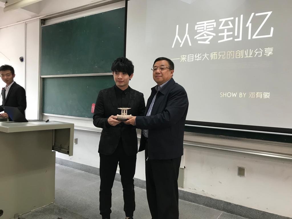 开讲前,主持人首先对邓有骏的创业史以及创业成就做了简要的介绍,校友工作办公室主任项士敏为邓有骏颁授了“校友讲坛”主讲嘉宾纪念碑。经济与金融学院为邓有骏颁发了经济与金融学院专业咨询委员会委员聘书。
