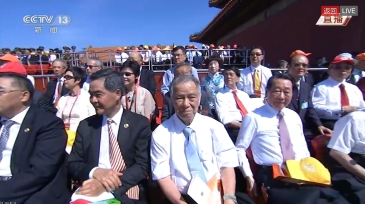 在这场举世瞩目的纪念活动中,来自海内外120个国家和地区的1779名爱国侨领和侨界精英翘楚,代表全世界6000万华人华侨受邀观礼。我校有来自10个国家和地区的近40位校董、校友代表受邀出席。在观礼嘉宾中,我校董事会副董事长、菲律宾著名爱国侨领陈永栽先生因德高望重,声名卓著,成为5位海外侨界杰出代表之一,荣幸受邀登天安门城楼观礼并出席招待会。