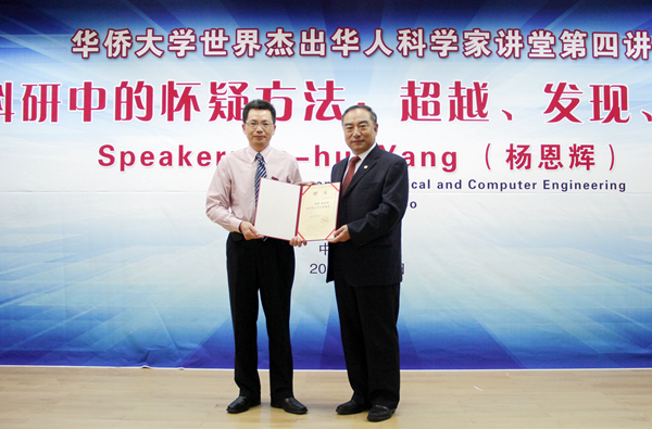 9月6日上午,我校1982级校友、第七届董事会董事、美国电气电子工程协会院士、加拿大工程院院士、加拿大皇家科学院院士杨恩辉返校讲学,做客“世界杰出华人科学家讲堂”第四讲,并欣然受聘我校名誉教授。