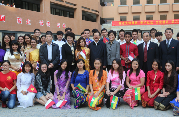 王刚还与在华大北区一号楼中庭排练海上丝绸之路艺术节开幕式节目的西班牙、印尼、缅甸等国家和地区的境外生亲切交流,关切地询问他们:“来华大多长时间了?”“语言关怎么过?”“是不是每次放假都回家?”“回去之后是不想搞旅游做国际贸易?”……在境外生的邀请下,王刚欣然与他们合影留念。