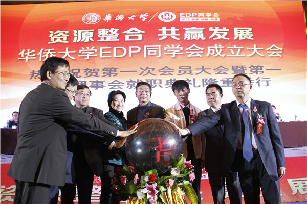 华侨大学校友总会会长李冀闽,党委副书记、校友总会理事长朱琦环等共同点亮启动球,并为首届理事会成员授会旗、颁发证书。泉州市各界嘉宾及EDP校友300多人参加成立大会。