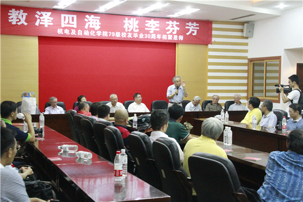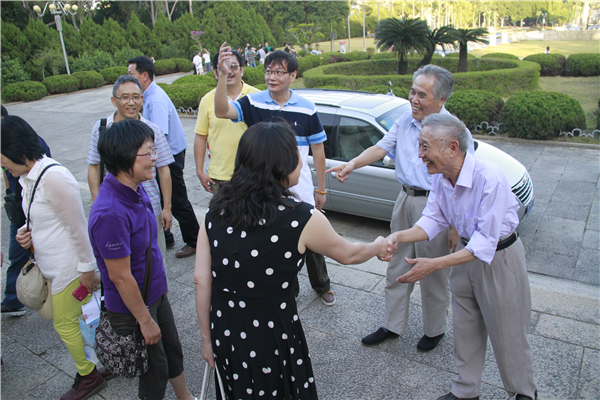 在陈嘉庚纪念堂二楼会议室,校党委书记关一凡热情接待了返校校友们。当年的任课老师陈子文、吴惠贞、姚祖斌、黄通农、汤东华、陈元霖、王树兜、何江川等也受邀前来参加座谈。一如30年前,班长周卫平一声口令,校友们纷纷起立,向恩师敬礼。关一凡对校友们的到来表示热烈的欢迎。他向校友们介绍了学校近年来发展所取得的新成就,并欢迎校友们“常回家看看”。座谈会上,老教师代表与校友们共同分享了一起学习、工作的美好回忆,感谢他们为母校增添了光彩。而校友们更是深情回忆起当年的求学生涯,纷纷与老师握手拥抱,并向恩师献上礼物以表达自己最崇高的敬意,现场感动而温情。